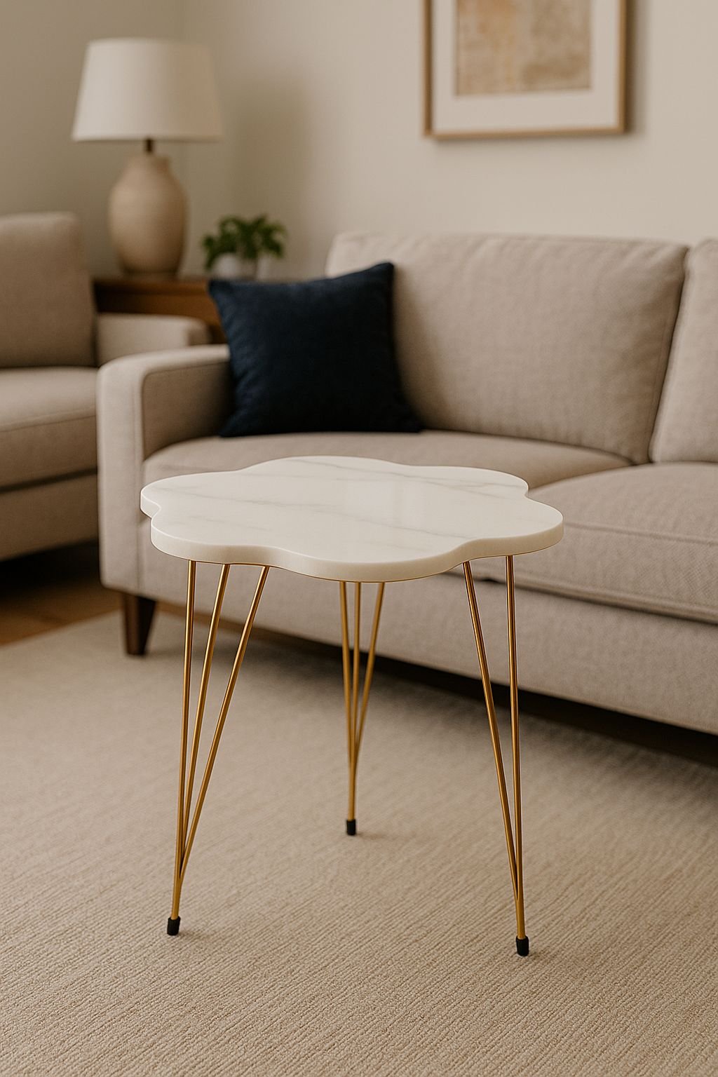 The CloudForm Wooden Accent Table adds a touch of whimsy and refinement to any room. Featuring a cloud-inspired contoured wooden top in a soft matte finish and paired with sleek golden metal hairpin legs, this table is a standout piece for contemporary or eclectic interiors. Its organic silhouette contrasts beautifully with the geometric legs, creating a balanced and stylish design. Perfect for living rooms, bedrooms, or reading corners, it brings charm without compromising functionality.