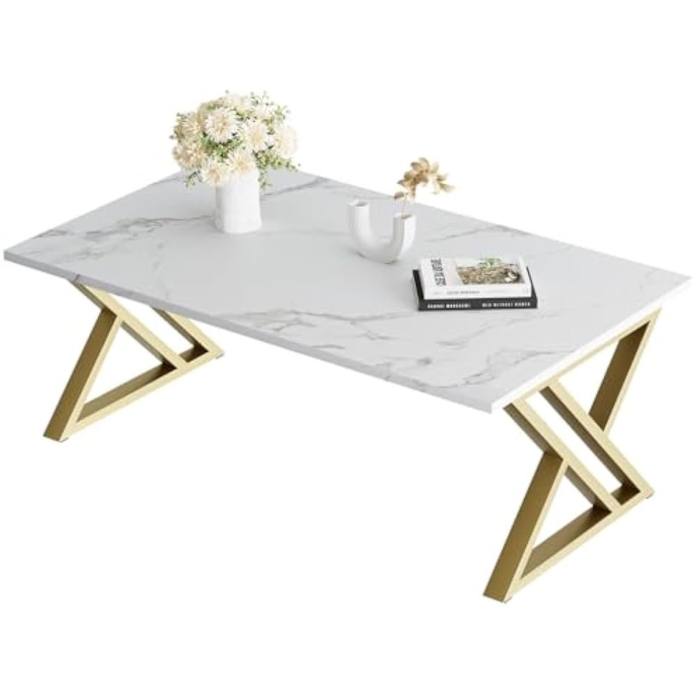 The Luxe X-Frame White Coffee Table combines a modern white marble top with a stylish gold X-frame, perfect for any contemporary living room.