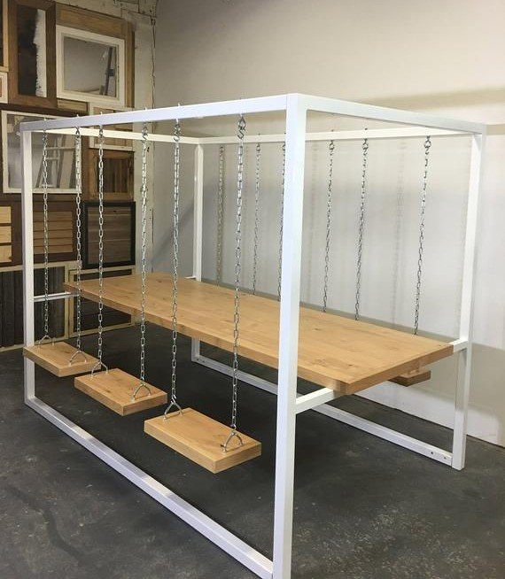 The Orbit Swing Dining Set features a suspended seating design that transforms any dining or workspace into a fun, interactive experience.