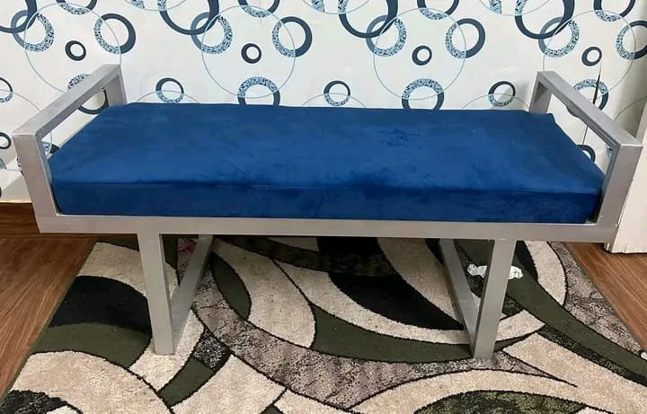 A sophisticated bench with a plush royal blue cushion and sleek stainless steel frame — perfect for modern homes.