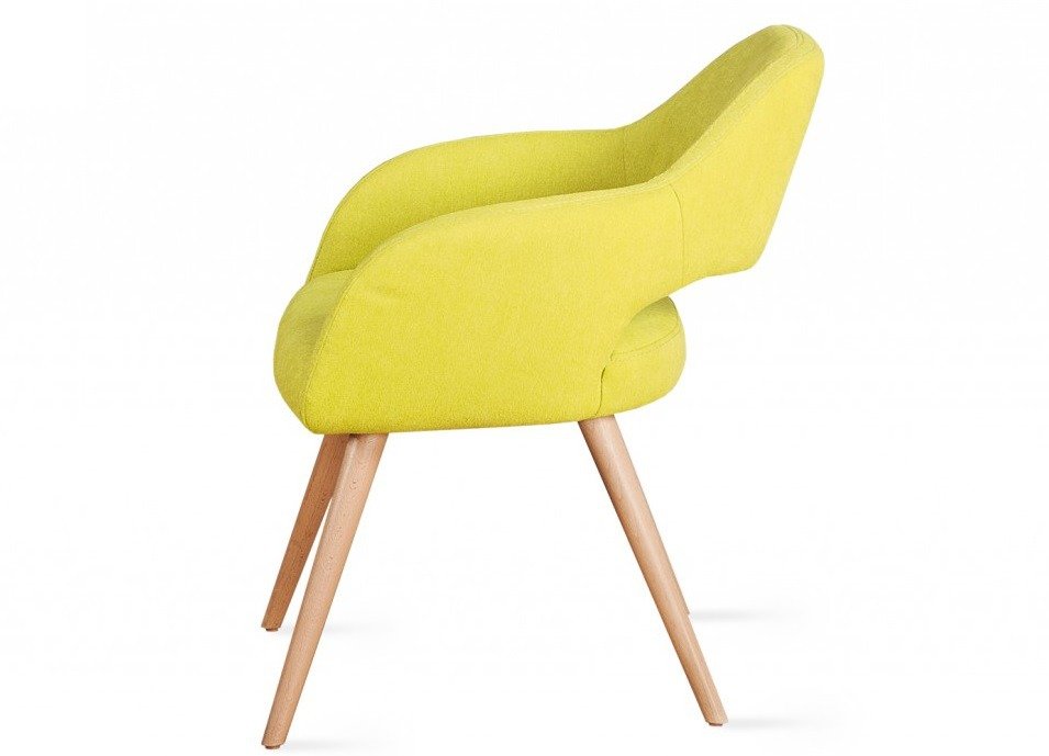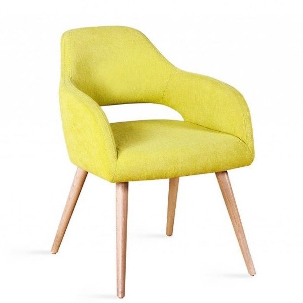 Stylish yellow dining chair with wooden legs, customizable colors.