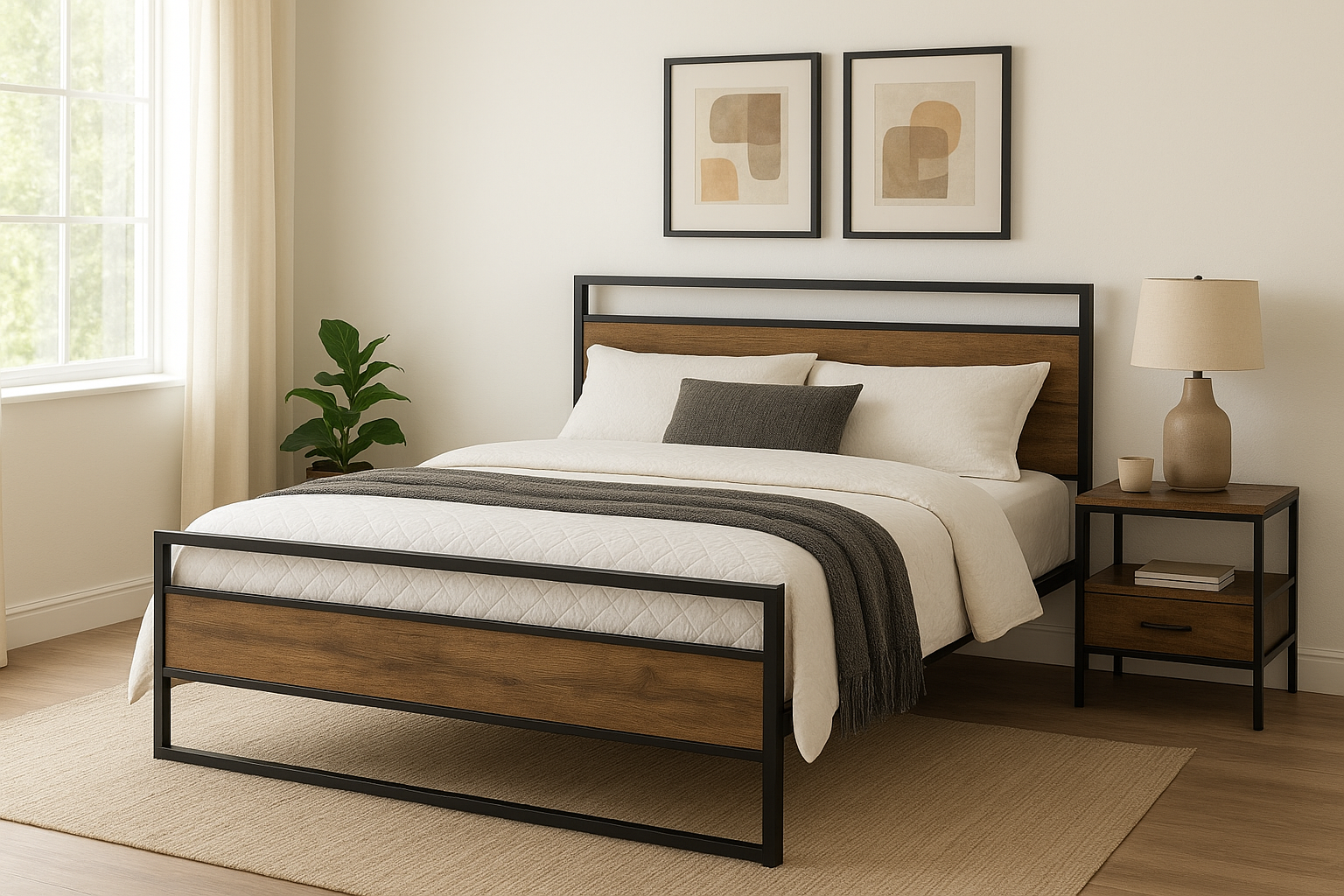 A modern yet timeless bed frame with a sleek black metal structure and rustic wood finish panels. The Windsor Bed blends industrial strength with natural warmth, making it the perfect centerpiece for any bedroom.