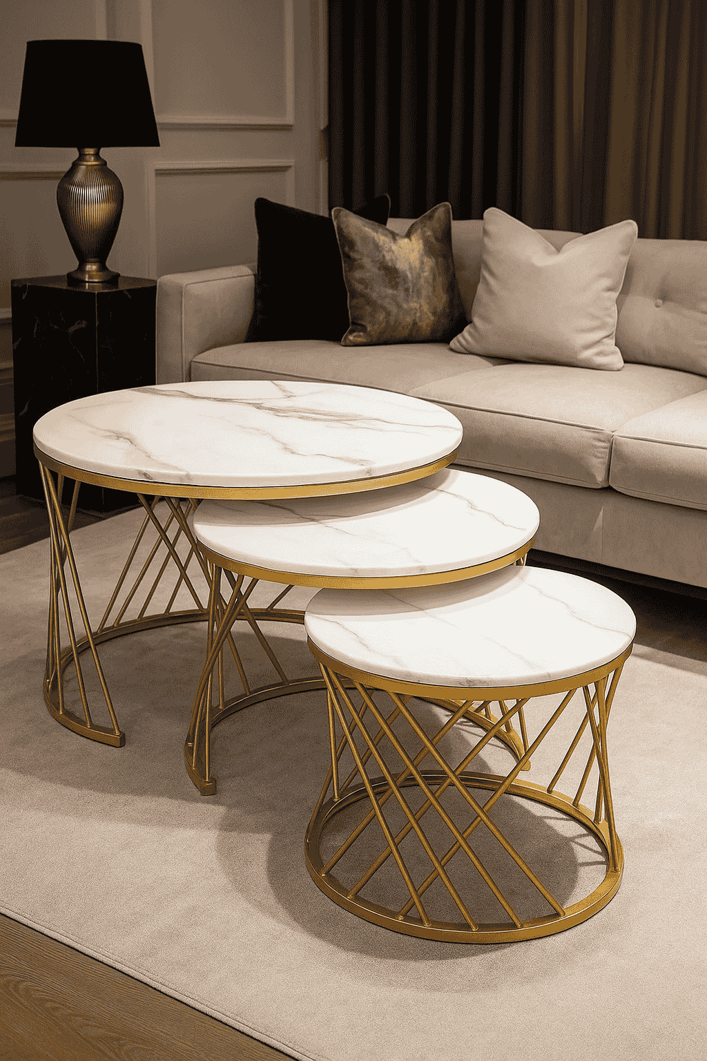 A chic set of 3 nesting coffee tables with white marble-style tops and gold metal frames, perfect for modern living spaces. Available in White, Black, and customized colors.