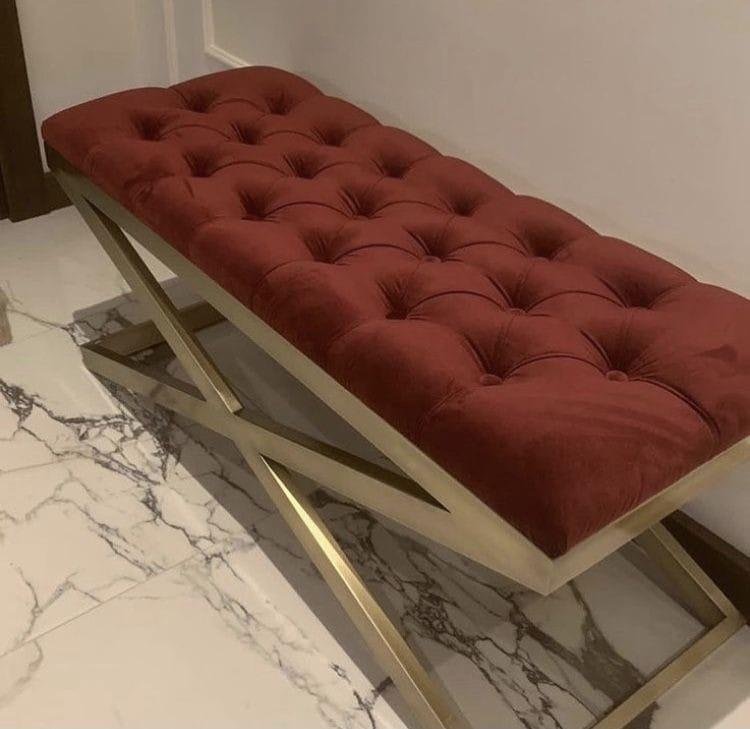 Stylish and luxurious Tufted Upholstered Bench with Gold Metal Frame designed for comfort and elegance. Ideal for adding a chic touch to any room.