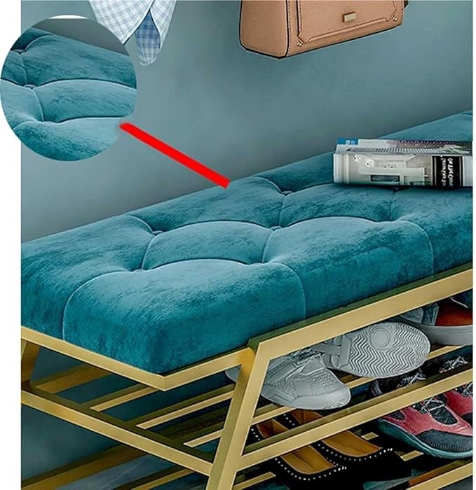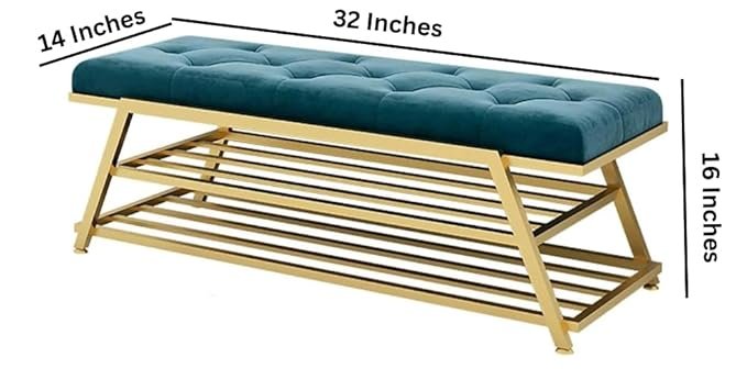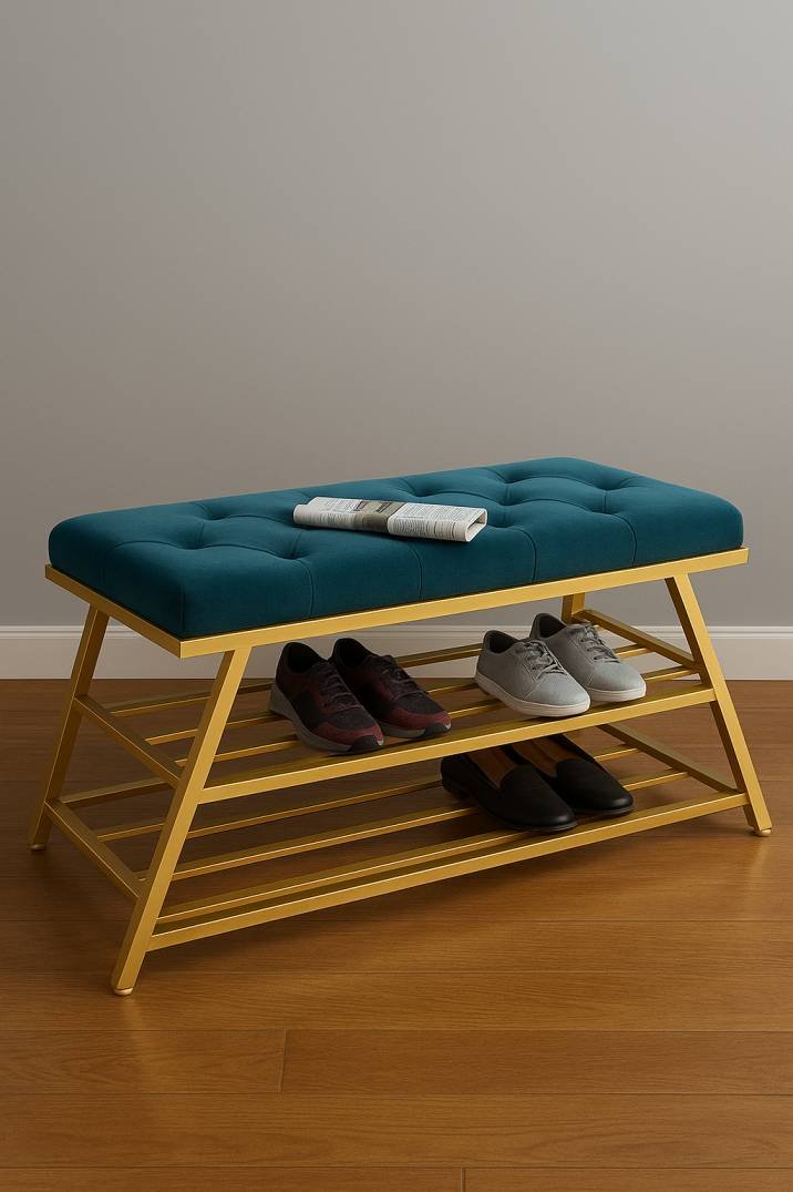 The Velvet Shoe Bench is a chic and functional piece of furniture, featuring a plush teal velvet cushioned top with tufted detailing, paired with a sturdy gold metal frame. This bench offers two spacious shelves for organized shoe storage, making it an ideal addition to entryways or hallways. Its elegant design combines comfort and practicality, perfect for both seating and storage needs.